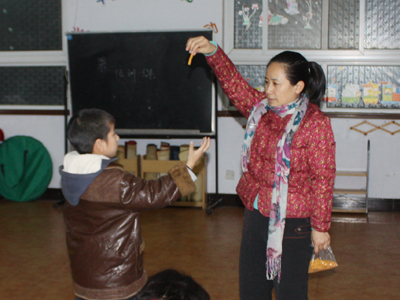在小义工们陪同下,张桂娥主任给梦辉做康复训练