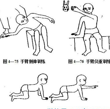 这类孩子,在睡觉时,双手应尽量远离体干,手臂向上旋转(如图4—78),在日常活动中,可让孩子趴于一圆柱、被褥或桌前(如图4—79),家长用一些玩具,看图画书或做游戏等方法,诱导孩子双手用力向前。