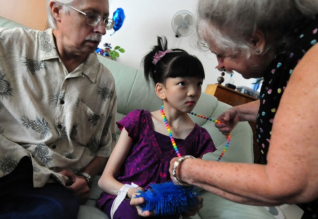 美国人约翰·戴维斯(John Davies )、妻子麦琪(Maggie)和患有大脑麻痹、自闭症的女儿琼坚(Qiongjian)。1997年,戴维斯夫妇在当地收养了这个弃婴。2009年10月26日,他们在中国最南端的海岛海南省三亚市,建立起走向光明康复中心(Bright Connection center )。20世纪90年代中期,这对夫妇从美国科罗拉州来到这个亚热带小岛,为蓬勃发展的旅馆业提供咨询服务。然而,当地迫切需要帮助的残疾儿童让他们为之动容。2004年,他们着手创建走向光明康复中心。中心现在照料并治疗着多达25个身患大脑性麻痹、自闭症或者同时患有这两种疾病的儿童。这些孩子中,有些是被不愿继续抚养他们的父母抛弃,有些则来自当地的孤儿院。(弗雷德里克·J·布朗(FREDERIC J. BROWN/AFP)/法新社/盖蒂图片社)