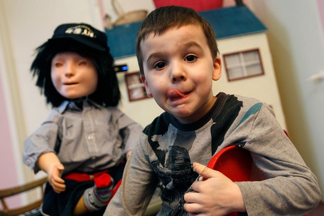 在一个研究项目中,罗尼·阿洛夫(Ronnie Arloff )以微笑回应机器人“卡斯帕”( 'Kaspar' )。自闭症孩子们跟科学家遥控操作的机器人玩了10分钟。根据程序设定,卡斯帕可以微笑、皱眉、大笑、眨眼睛和挥动手臂。摄于:2011年2月28日,周一,英国哈特菲尔德。(美联社图片/阿拉斯泰尔· 格兰特(Alastair Grant))