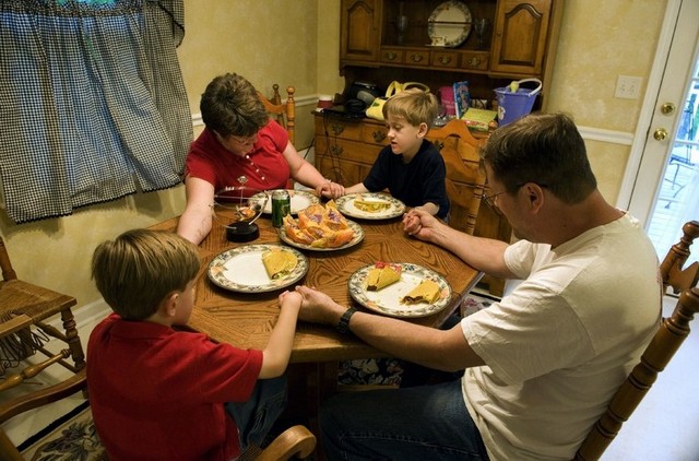 当地时间2010年4月21日,美国乔治亚州,玛丽埃塔市。晚餐前,珍妮弗和丈夫迈克尔为两个患有自闭症的双胞胎儿子Ben和Sam祈祷。