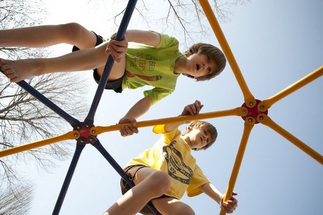 当地时间2011年2月19日,美国乔治亚州,玛丽埃塔市。Ben和Sam时年8岁,正在自家后院里攀爬。这对双胞胎被诊断为自闭症时仅18个月大,他们正在努力练习口头表达与交流能力。