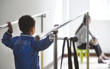 3岁的阳阳站在圆形的训练器具上绕圈圈,眼睛不停地来回张望,有时还会忘记走动,康复老师需要不停用手挡住他的视线,使他集中注意力。只有用大声的呼喊和扳动头部,才能吸引到他们的注意。
