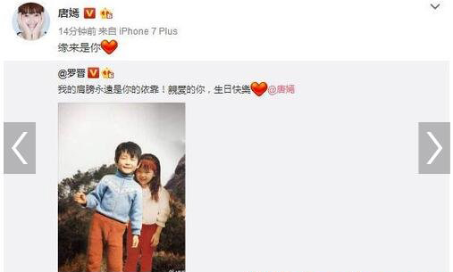 12月6日,唐嫣的生日,中午,罗晋发文公布与唐嫣恋情:“我的肩膀永远是你的依靠!亲爱的你,生日快乐”,并十分有心的将唐嫣和自己的童年旧照P在一起。