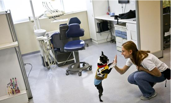 近日,在智利圣地亚哥洛斯安第斯大学医疗中心,一名自闭症患儿在接受牙医治疗时把双手放在一条治疗犬的爪子上。由非盈利组织训练的这种治疗犬是专门用来陪伴患有自闭症的儿童患者的。有治疗犬的陪伴,患儿的恐惧心理可以得到缓解。