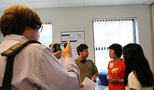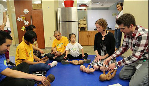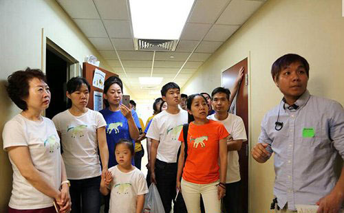 老师、家长还有孩子认真听费城自闭症中心老师的讲解。